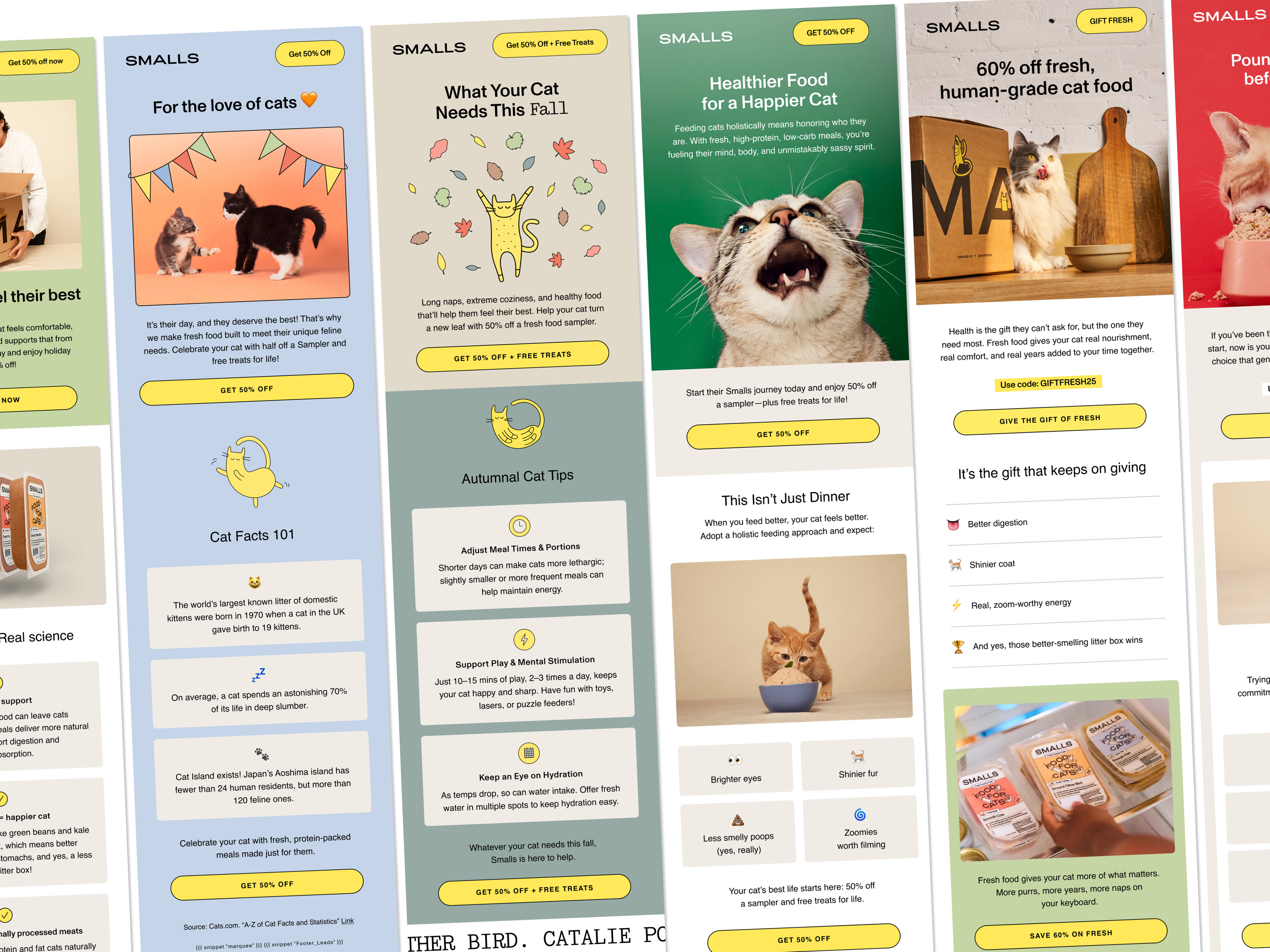 Email marketing design for Smalls, a direct-to-consumer pet food brand focused on fresh, human-grade nutrition for cats.